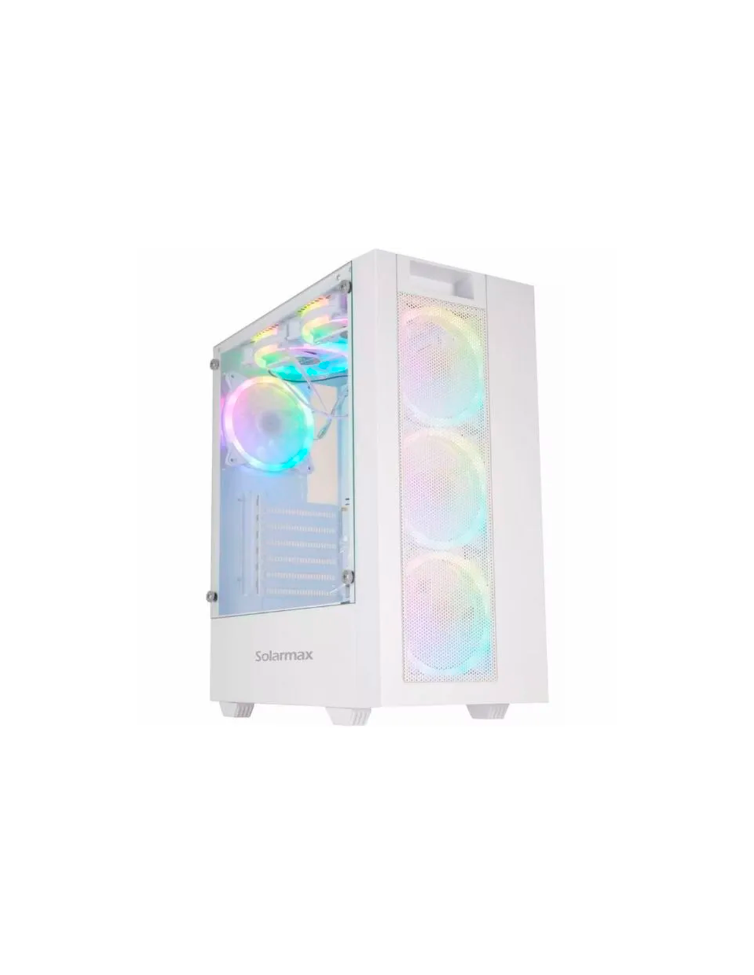 Gabinete Solarmax CM-5920 White Mesh TG con 6 ventiladores ARGB. Flujo de aire superior, estética limpia y amplio espacio para armar un setup gamer potente y moderno.