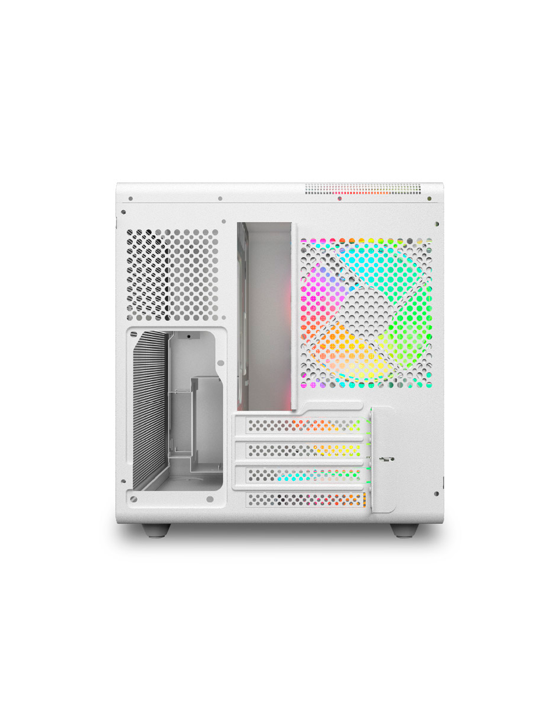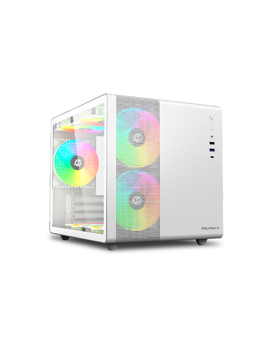 Gabinete Solarmax CM-W300 White TG tipo cubo con 3 ventiladores RGB. Diseño compacto, excelente flujo de aire y estética premium para armar un setup moderno y ordenado.