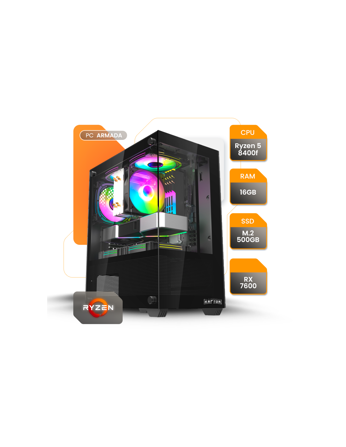 Potente PC Gamer con Ryzen 5 8400F y RX 7600, 16GB RAM y SSD 500GB. Rendimiento de próxima generación para juegos exigentes y experiencia fluida con eficiencia 80+.