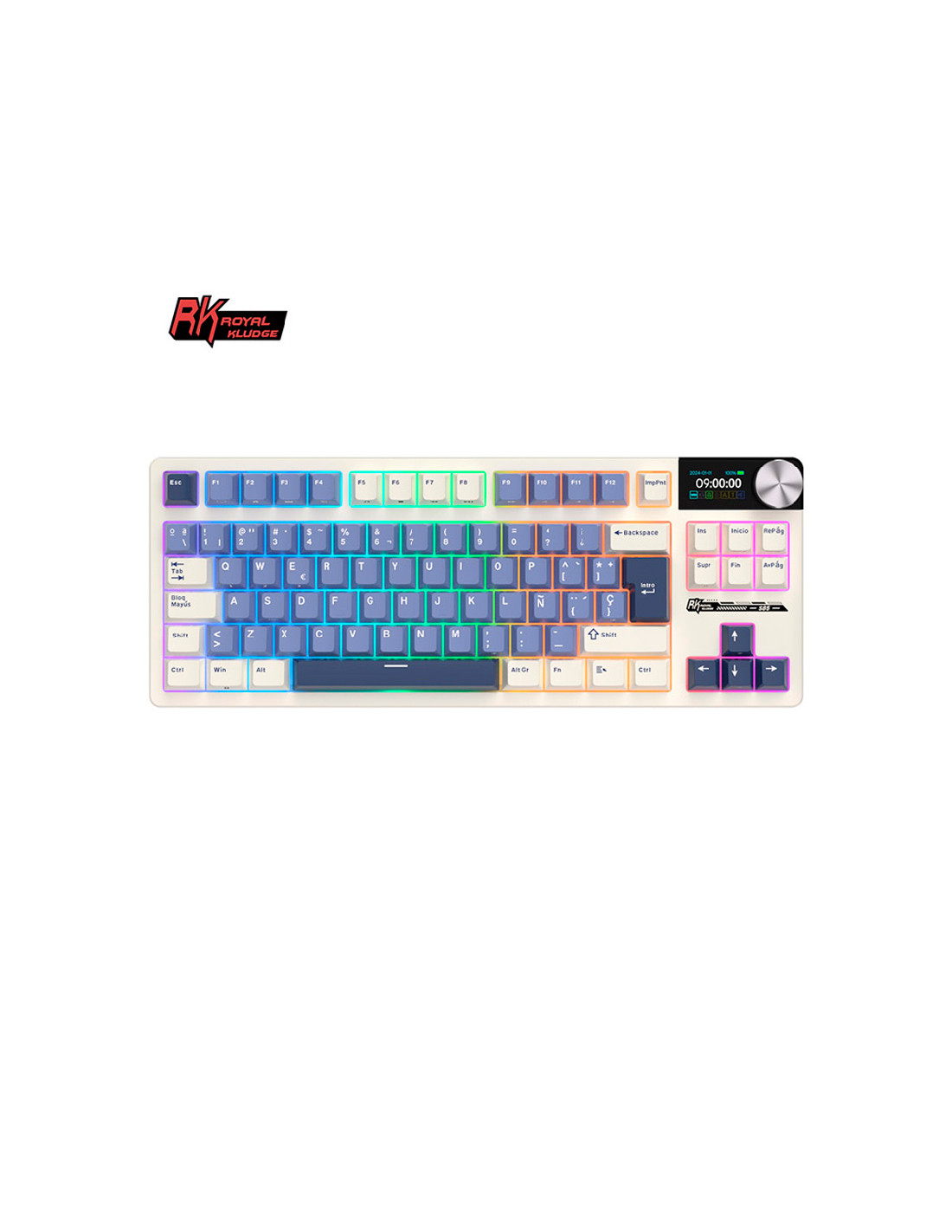 El Royal Kludge RKS85 Horizon Blue con switches Beige ofrece un diseño compacto 85%, escritura precisa y estética azul pastel ideal para setups elegantes, cómodos y funcionales.